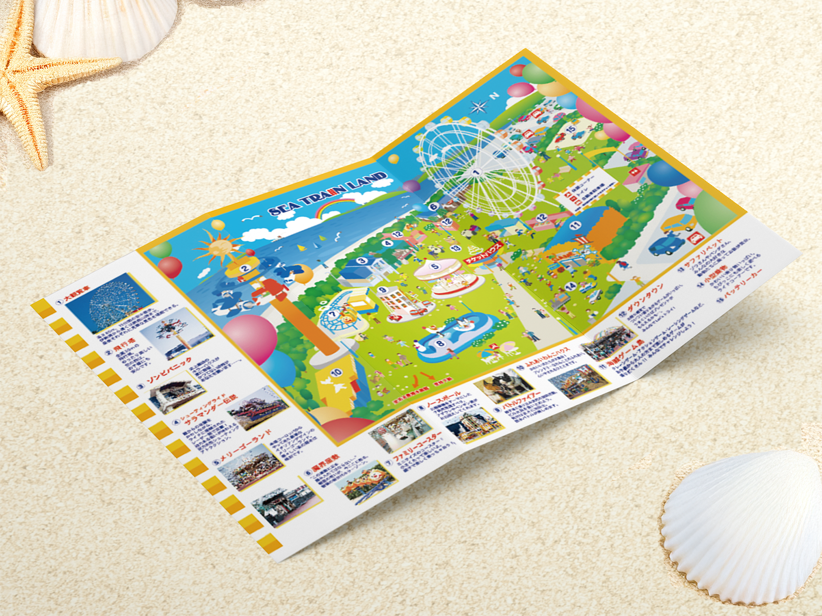 たくさんあるアトラクションを分かりやすく紹介するため、マップはイラスト化して楽しい雰囲気に仕上げることで、見やすいデザインにしました。