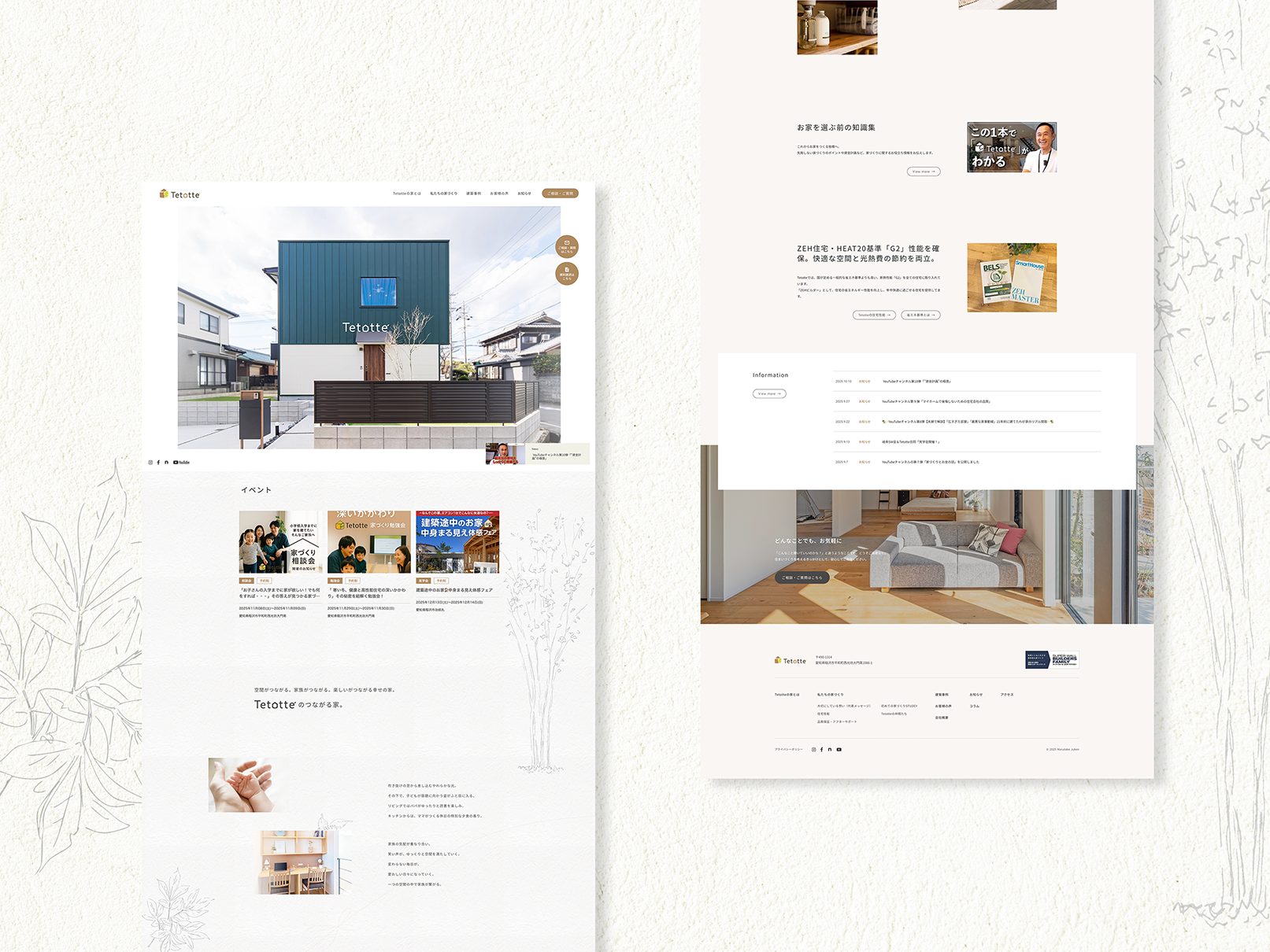 丸武住建株式会社様の新ブランド「Tetotte(てとって)」のコンセプトに合わせて、新しいホームページを制作させていただきました。リブランディングにあたり、ブランド名やコンセプトの立案からお手伝いさせていただき「繋がる」をテーマに丸武住建株式会社様の家づくりに対する想いがより伝わるよう、ホームページの構成や文章、ビジュアル表現までトータルでデザインしました。この度は新たなスタートのお手伝いをさせていただき誠にありがとうございました。