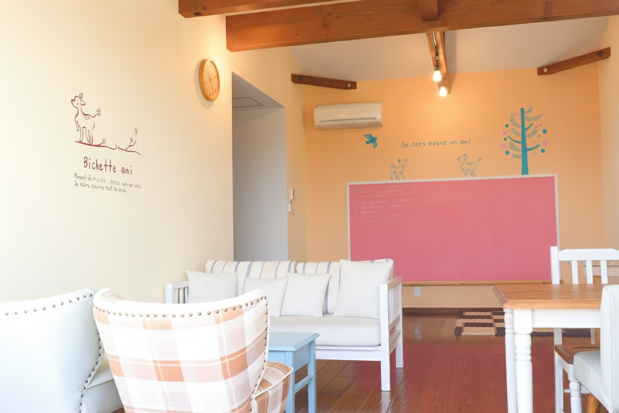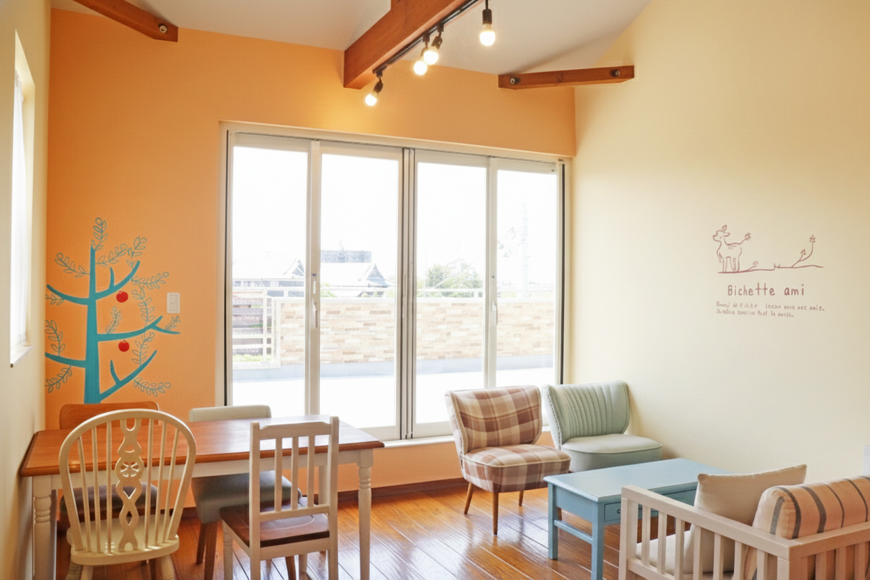 - 1FはSHOP空間。2Fは若いお母さん達の交流の場として空間と切り分け、bichette ami(愛しい友達)ネーミング。
