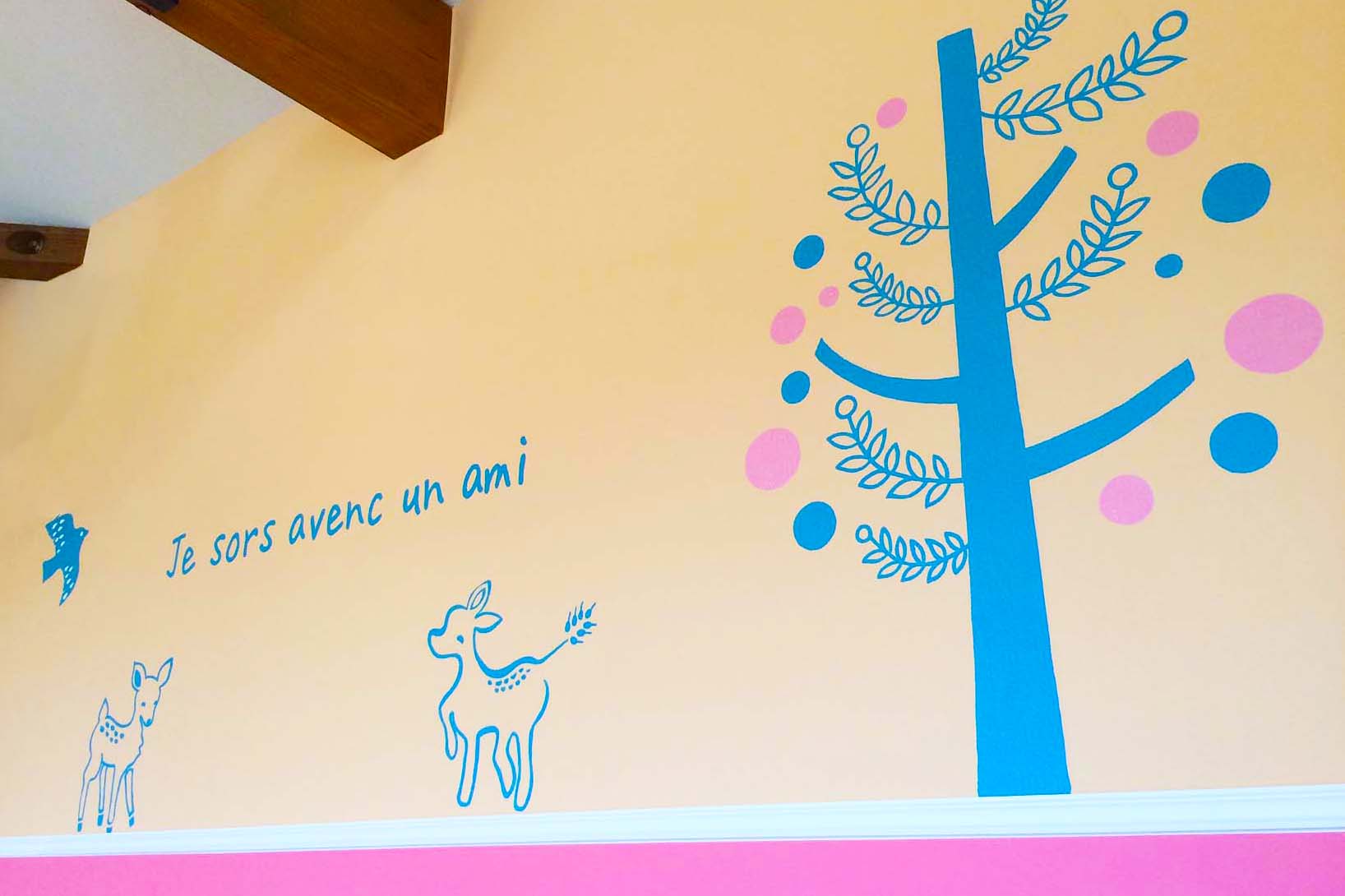 イラストは小鹿が楽しそうに遊んでいる様子を手で描き、やわらかな風合を出しています。