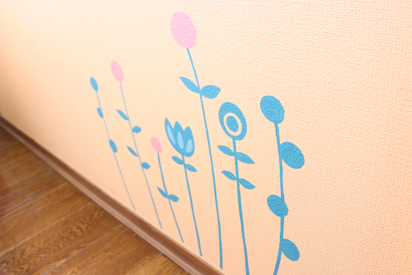 - 北欧風の手描きイラストでピンク・ブルー等の色を使ってアクセントを。