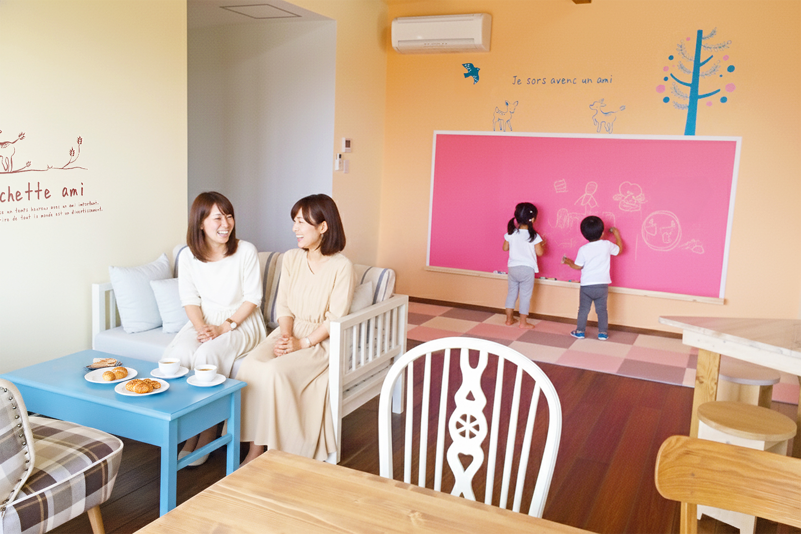 子供が絵を描いて遊んでいる。お母さんは安心してお友達とお喋りできる空間。
