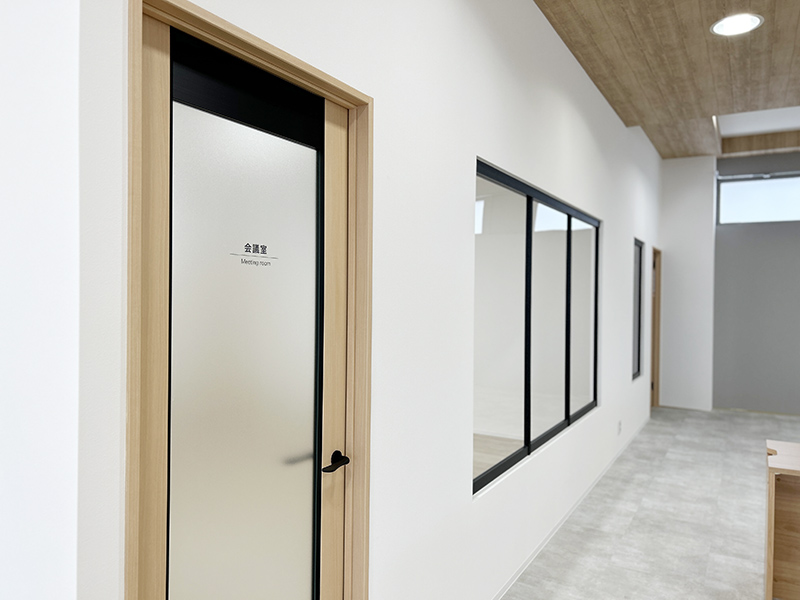 • 事務スペースと商談スペースにあえて間仕切りを作らず、床材と天井の素材を変えることで空間を緩やかに別けています。